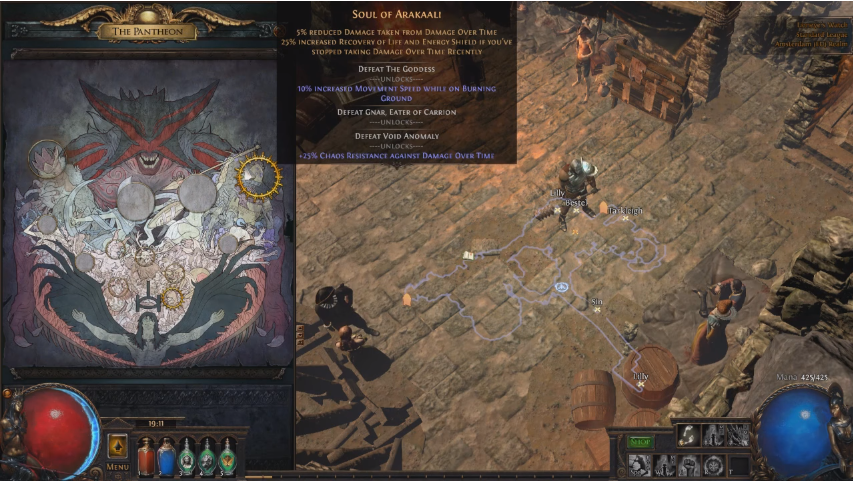 Abgesehen von den neuen Kapiteln kommt mit der Erweiterung auch das neue Pantheon-System mit an Bord. Nun bleibt es nicht mehr bei den Monstern, die man besiegen muss, auch die verschiedenen Götter auf Wraeclast kommen dazu. Schafft man es, diese zu bezwingen, raubt man ihnen Teile ihrer Macht und nimmt sie in sich auf. Im Pantheon-Menü kann man sich an den neuen Fähigkeiten bedienen und sich noch mächtiger ausrüsten.
